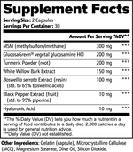 Ingredients: MSM (methylsulfonylmethane), GlucosaGreen® vegetal glucosamine HCl, Turmeric Powder (root), White Willow Bark Extract, Boswellia serrata Extract (resin)(std. to 65% boswellic acids), Black Pepper Extract (fruit) (std. to 95% piperine), Hyaluronic Acid.