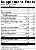Ingredients: Vitamin A (as retinyl acetate), Vitamin C (as ascorbic acid), Vitamin D (as cholecalciferol), Vitamin E (as dl-Alpha tocopheryl acetate), Vitamin B-6 (as pyridoxine HCI), Folate, Vitamin B-12 (as cyanocobalamin), Biotin, Pantothenic Acid (as calcium d-pantothenate), Iodine (as potassium iodide), Zinc (as zinc citrate), PABA (para-Aminobenzoic Acid), Collagen (piscine), Silicon, Glucose syrup, Sugar, Glucose, Pectin, Citric acid, Sodium citrate, Passion fruit flavor, Vegetable oil (contains carnauba wax), Purple carrot juice concentrate.